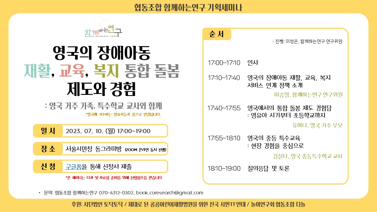기획세미나 <영국의 장애아동 재활, 교육, 복지 통합 돌봄 제도와 경험> 안내 (2023.07.10)